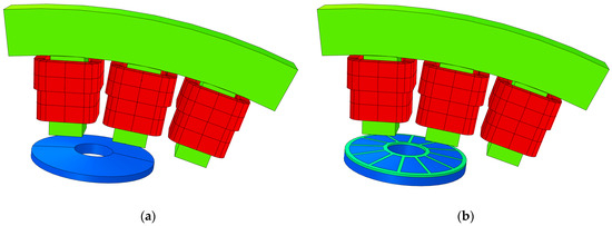 The proposed modifications were the simplest from a device design point of view. They required changes to the design of only the drive plate and the poles without interfering with the other parts of the system. Improvements in electromagnetic torque characteristics can also be achieved through other design changes. An example of such modifications might be a complete redesign of the stator, moving it under the drive plate. This arrangement can further increase the torque of the drive plate by compensating for the centrifugal force acting on the drive plate by the force of attraction of the ferromagnetic part of the drive plate by the poles.