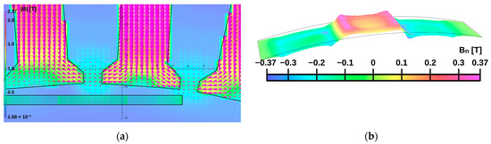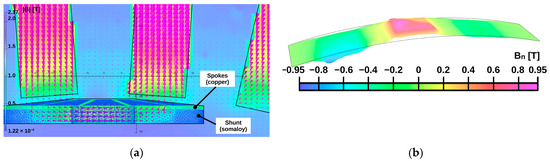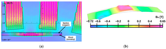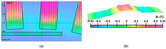 Figure 16b), was significantly increased by adding a magnetic shunt under the conductive layer of the disc. The maximum value of this component under the poles increased to about 0.65 T. Using a plate with a conical geometry reduced and slightly smoothed the air gap. This increased the value of the normal component of the magnetic flux density in the air gap significantly—for the spoke disc (