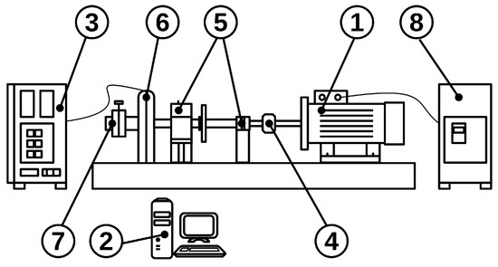Figure 18) is equipped with two vibration sensors (mounted on one bearing mounting) and three inductive sensors. Rotation angle measurement was carried out using three inductive sensors: type IFS248—IFK3004BAPKG/US-104 (ifm electronic Sp. z o. o., Katowice, Poland). One of them received one signal for each shaft revolution, while the other two sensors received one signal for each revolution of the balancing discs. Knowing the initial angular position of the balancing discs about the shaft and the shaft’s rotation speed, the displacement angle of the balancing discs in relation to the shaft was calculated. Stators and the drive system were both placed in the same plane. In the test stand diagram, the system is moved from the correct plane to better show the components of the test stand.