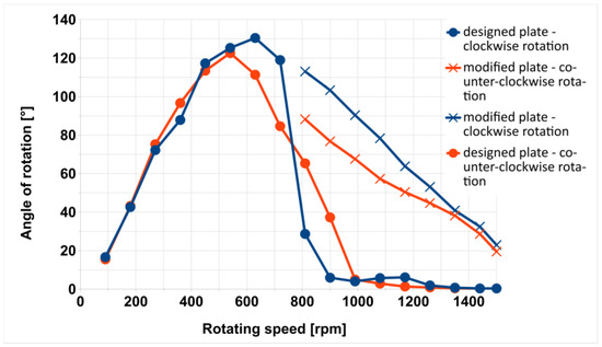 These tests were performed on a prototype of a fan shaft balancing system. They consisted of powering the stator windings for 3 s for the designed plate, while for the modified plate, powering the stator windings lasted 1 s while the entire system was spinning, and then stopping the system and measuring the plate rotation angle. The difference in the switching time resulted from the device’s design, which did not allow one of the balancing discs to rotate by more than 120°. The tests were carried out for a system rotating in both directions, in a speed range of 800 rpm to 1500 rpm, for which the system did not operate correctly. The results of the measurements are shown in
