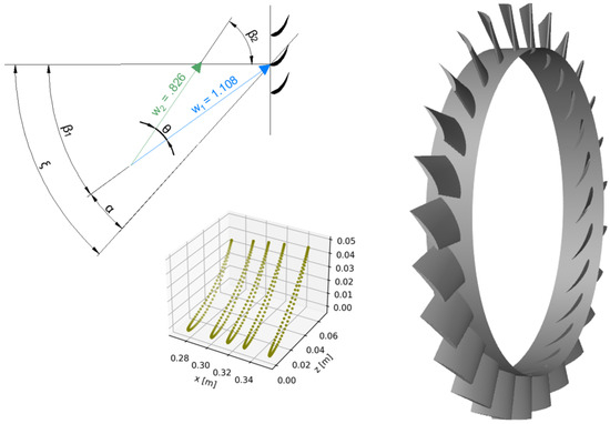 The adiabatic efficiency (Equation (8)) of the rotor was determined from an empirical formula using the predicted value of the lift coefficient, which was determined from the results of experimental cascade studies. This value was averaged over the flow parameters, including the resulting relative inflow angles (), angle of attack (), and blade turn angle (), for five control cross-sections along the rotor radius (hub, inboard, pitch, outboard, and tip) [44]: