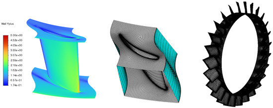 A computational grid was produced for each of the modified geometries using Turbogrid software [39]. The mesh type used was hexagonal grids comprising an O grid around the blades and an H grid within the flow channels. To improve the resolution in specific areas, namely the blade wall, the hub, and the tip, element densification was increased. This increased density in areas with high gradients provided greater resolutions, resulting in a more accurate representation of the flow conditions and loads in the analyzed rotors. The number of elements in each grid was in the range of 250,000–300,000. The grid was compacted in a manner which ensured that the dimensionless distance from the wall fell within the requisite range for the selected turbulence model. In the case of the model employed in this study (k-omega SST) [40], an accurate representation of the near-wall layer was achieved for values below 5. Figure 3 presents an overview of the grid for the reference case, accompanied by the distribution for the design case conducted within the velocity range corresponding to the highest rotational speeds. An analysis of the distribution revealed that the resulting value was consistently below 5 across the entire range of walls.