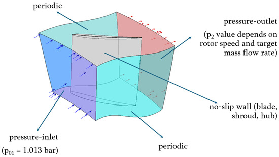 The boundary conditions employed in the numerical simulations were consistent across all cases under consideration. At the inlet, a pressure boundary condition was used, with the inlet value set to the atmospheric pressure. A pressure boundary condition was also applied at the outlet, with the static pressure value dependent on the rotor speed and the mass flow through the inter-blade flow channel. Since the simulation was conducted for a single blade, a periodic surface condition was implemented. The blade, hub, and tip walls were defined as no-slip walls. An illustration of the applied boundary conditions in relation to the rotor geometry is presented in Figure 5.