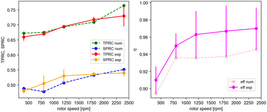 Figure 6 illustrates the simulation results for the reference case compared with the experimental values, including the associated error bars. The results for the adiabatic efficiency exhibited a discrepancy of approximately 2% with respect to the experimental data. However, the discrepancies between the measured TPRC and SPRC values were deemed to be within an acceptable range. It can thus be concluded that the numerical scheme employed to obtain the flow fields accurately determined the values of the flow variables and could be utilized to analyze the flow field in modified geometric cases of the reference rotor. The values obtained using this efficiency definition were smaller than those obtained using the empirical formula. The latter assumes the value of the lift-to-drag ratio , which can be obtained in a full rotor system with a stator, thereby improving the stability of the flow field. Additionally, the empirical formula is dedicated to rotors with a higher Reynolds number than the range considered in this paper (above 500,000). It should be noted that the efficiencies obtained using this approach were higher than the actual ones.