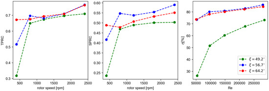 Figure 7 illustrates the correlation between the resulting pressure increase coefficients and rotor speed, as well as the dependence between the isentropic compression efficiency and the Reynolds number. The incidence and deflection angles of the flow are influenced by the blade angles, which in turn affect the energy transfer from the rotor to the fluid. The optimal blade angle minimizes flow separation and reduces aerodynamic losses, thereby enhancing the efficiency of the compressor. From the graph, it can be observed that the rotor achieved higher efficiency values for higher blade angles within the range of 74–84%. Furthermore, it can be seen that increasing the blade angle did not result in a significant improvement in compression efficiency. However, it is noteworthy that the highest values for the static pressure increase were obtained for the design’s blade angle. An increase in the angle of attack resulted in a reduction in the static pressure increase, which was directly reflected in the flow kinematics. The axial velocity values obtained were higher, which generally improved the rotor performance. However, this also increased the losses associated with a higher turbulence intensity, which in turn contributed to the potential occurrence of secondary phenomena related to secondary flows and an increasing boundary layer. These two factors are in equilibrium with one another, resulting in comparable efficiencies for the optimum and increased blade angles. A reduction in the blade angle to 49.2 degrees resulted in a notable decline in compression efficiency, particularly within the lower Reynolds number range under consideration. The elevated losses are attributable to localized flow separation, which gives rise to augmented flow losses and a concomitant reduction in efficiency.
