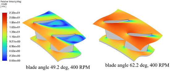 In all cases analyzed, a trend can be observed where the efficiency declined at Reynolds numbers less than 100,000. At a rotational speed of 400 RPM, the tip velocity was approximately 15 m/s. The low velocity range gave rise to a number of phenomena resulting in a reduction in rotor efficiency. At lower speeds, the resulting angle of attack was suboptimal, resulting in improper attachment of the fluid to the blade surface. This consequently increased the risk of boundary layer separation and the formation of turbulence structures, which in turn increased energy loss. A reduction in the flow angle resulted in a significant decline in efficiency, reaching a value of 28%. A detailed examination of the flow field depicted in Figure 8 revealed the precise location of the area of the tip leakage vortex. In the case of larger blade angles, separation was not observed at low speeds. However, due to the low kinetic energy, the flow stability was underestimated, and the pressure increase values were significantly lower. This also led to a decrease in rotor efficiency of approximately 5%.