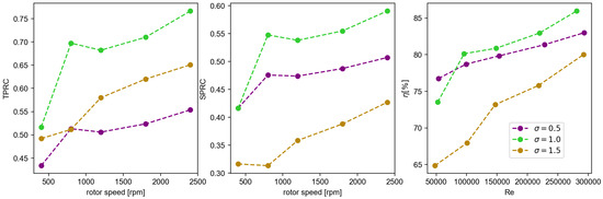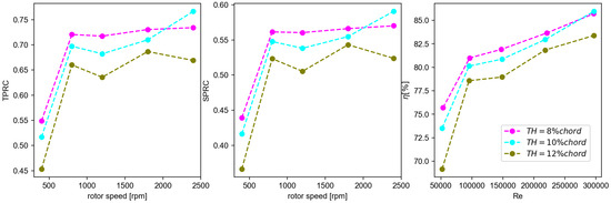 To gain insight into the rotor’s performance, a series of simulations was conducted, varying the rotor speed between 400 and 2400 RPM. This resulted in a Reynolds number range from 50,000 to 250,000, which is representative of the kinematics of the flow. A modification of the geometry (cases 8 and 9) was carried out with the objective of obtaining the same Reynolds number of 150,000. This allowed an assessment of the impact of the rotor size on the efficiency while maintaining a constant ratio of inertia forces to viscous flow forces.
