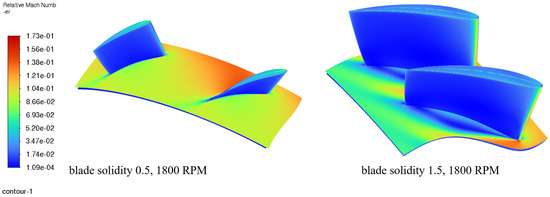 Relative Mach number distribution. Hub corner separation for the modified case with a solidity of 1.5 can be observed.