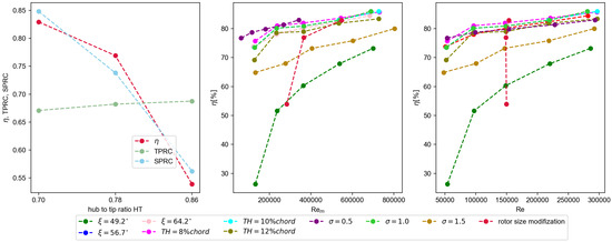 where is the velocity of the gas entering the rotor, is the density at the rotor inlet, and is the dynamic viscosity. By utilizing the definitions of the mass flow rate, blade solidity, and assuming axial inflow with a constant chord length along the radius, a simple relationship between the considered parameters can be derived (Equation (5)). The full derivation is provided in Appendix A. The modified Reynolds number differs from its classical form by directly accounting for the hub-to-tip ratio , the blade solidity at the mean radius , and the number of blades :
