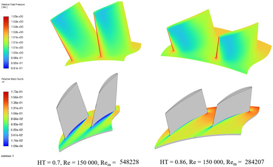 Low Reynolds number (Re) conditions lead to higher viscous losses and reduced flow turning, significantly impacting compressor performance [24]. A low Re causes flow separation on the suction surface and boundary layer thickening, which diminishes the static pressure rise and increases the total pressure loss. Research conducted in [25,26] showed that in the range of Reynolds numbers smaller than approximately 60,000, the total pressure loss increases significantly [25,26].