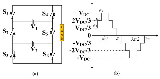 For simplicity, harmonic mitigation for MPUC7 is discussed in this section. In similar fashion, the formulation of MPUC5 can be achieved [14,21]. As shown in Figure 2b, the output voltage of the seven-level MPUC will have three positive, three negative, and one zero levels. Thus, for level 7 of the MPUC, the output voltage can be written as