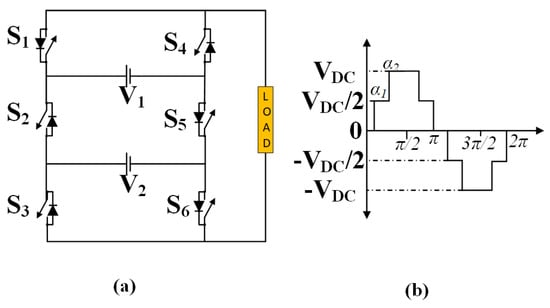 The modified seven-level PUC (MPUC7) is a highly efficient topology designed to achieve fine-grained voltage output levels using a single primary DC source and an auxiliary DC source. In this configuration, the auxiliary DC source is maintained at one-third of the primary source’s voltage as shown in Figure 2a. Using six switching devices and these two sources, the inverter can generate seven distinct voltage levels: and , as shown in Figure 2b.