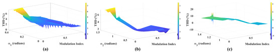 In the case of the MPUC5 inverter, the hybrid GA-PSO algorithm will seek the optimization of two switching angles for a minimum value of THD and desired modulation index. Because there are only two angles to optimize, the methodology is less computational and remarkably improves harmonic suppression. The Python implementation using VS Code is the same as for MPUC7; results are shown in Figure 6. The 3D plots show the relation between THD, modulation index, and the optimized angles. This hybrid algorithm has very good robustness to balance both THD minimization and modulation index requirements by meeting operational constraints on an inverter. The results highlight how two-angle optimization is quite suitable for simpler topologies like MPUC5, where the needs for computational efficiency and harmonic performance are of major importance.