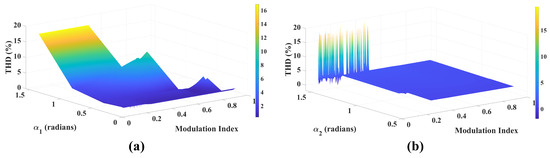 Variation in corresponding THD and modulation index for MPUC5 with different switching angles (a) ; (b) .