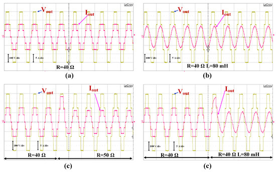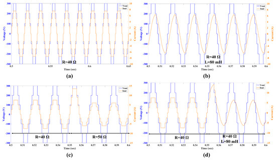 Simulated in Matlab/Simulink voltage and current waveform for MPUC5 under (a) fixed R−load, (b) fixed RL−load, (c) varying load from R−load to RL−load, and (d) varying R−load from to .