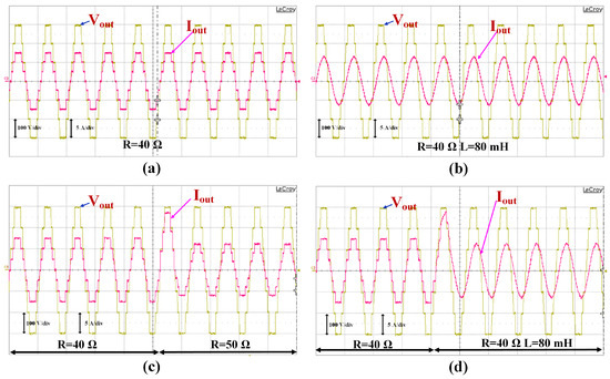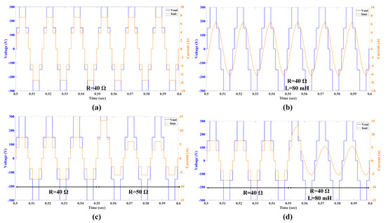 Simulated in Matlab/Simulink voltage and current waveform for MPUC7 under (a) fixed R−load, (b) fixed RL−load, (c) varying load from R−load to RL−load, and (d) varying R−load from to .