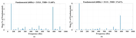 Figure 13 provides the FFT analysis of the output voltage for both the MPUC7 and MPUC5 inverters, demonstrating the harmonic suppression achieved by the proposed hybrid GA-PSO optimization technique. In Figure 13a, the FFT analysis for the MPUC7 inverter shows the dominant fundamental frequency at , with significantly reduced lower-order harmonics, such as the third, fifth, and seventh harmonics. The Total Harmonic Distortion (THD) is measured at 11.68%, confirming the inverter’s ability to achieve effective harmonic elimination. Figure 13b presents the FFT analysis for the MPUC5 inverter, where the fundamental frequency is also observed at , but the harmonic components are slightly more pronounced compared to MPUC7. The THD for MPUC5 is measured at 17.61%, which is higher due to the lower number of voltage levels. These results clearly demonstrate that the proposed hybrid GA-PSO algorithm effectively minimizes THD and mitigates harmonic distortions, with MPUC7 achieving superior performance owing to its higher voltage levels.