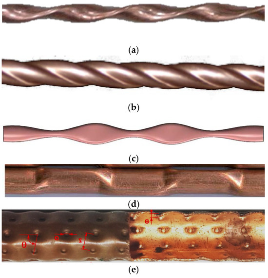 The active enhanced heat transfer technology needs to apply external force, which increases the complexity of the heat transfer process and adds more instability to the heat transfer process. The passive enhanced heat transfer technology, which is simple, energy-saving, and high safety, is widely used in industry. The passive enhanced heat transfer technology mainly includes processing rough surfaces, changing tube shape, and inserting turbulence elements in the heat transfer channels [3,4,5,6]. Among all kinds of enhanced tube structures used in convective heat transfer, the spiral structure has the advantages of saving equipment space, low production cost, and superior heat transfer performance [7,8]. The principle behind the heat transfer enhancement of the spiral structure lies in the helical flow and secondary flow induced by the twisted curved tube wall, which changes direction, and the radial and tangential velocities that generate intense flow mixing, thereby destroying the flow boundary, so as to achieve the purpose of disrupting the flow state. The application of spiral structures, such as a twisted oval tube and a twisted tri-lobed tube, etc., [9,10] as shown in Figure 1a,b, achieve heat transfer enhancement by applying a deformation to the tube wall to change the shape of the flow section, such as an alternating cross-section flattened tube, an alternating elliptical axis tube, and dimpled tubes [11,12,13], as can be seen in Figure 1c,e.