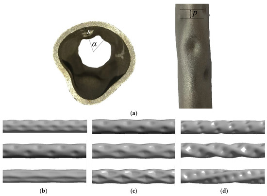 Schematic diagram of the structural parameter (a) and the vortex-enhanced tubes with the different spacing (b), depth (c), and helix angle (d).