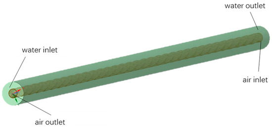 The realizable k-ε model is chosen to simulate turbulent flow. The enhanced wall function method is used for the near-wall treatment. Liquid water is assigned as the fluid outside the tube, while air is designated as the fluid inside the tube, and the following boundary conditions are established. Given the pressure outlet and velocity inlet, the air inlet temperature is 298.15 K, and the inlet temperature of liquid water is 363.15 K. The velocity inlet of air is set as 5–15 m/s, which is the air velocity of the tube inside, common in industry, the mass flow rate in the corresponding working condition is about 15–65 m3/h, and the velocity inlet of water is set as 1 m/s. Pressure–velocity coupling is chosen for the SIMPLE scheme, spatial discretization is established as second-order upwind for momentum, and turbulent kinetic energy is selected. The convergence absolute criteria condition was set to less than 10 × 10−6.