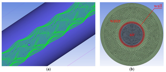 This model adopts a Mesh module of ANASYS program for discretization. Since the geometric model was obtained through explicit dynamics calculation, it will produce drastic geometric structure changes on the surface of the dimple. Unstructured grids were adopted for discretization of the geometric model and mesh refinement. A refined boundary layer grid was generated near the basin wall to satisfy the application requirements of the wall function method. The size of the tube inside the grid was set as 1 mm, the size of the vortex-enhanced tube grid was set as 1 mm, and the size of the tube outside the grid was set as 2 mm. The surface mesh of the vortex-enhanced tube is shown in Figure 4a. Set the boundary layer: the inner tube coupled with tube wall faces inward expansion, the outer tube coupled with the wall faces outward expansion, and the outer faces inward expansion. Set the transition ratio of expansion parameters as 0.9, the maximum layers as 4, and the growth rate as 1.2. The generated mesh is shown in Figure 4b.