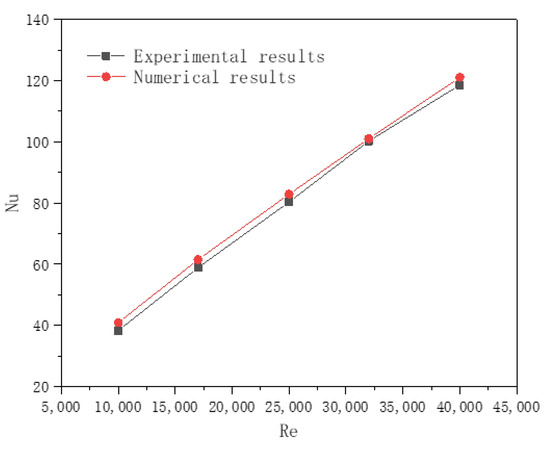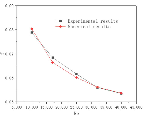 To validate the numerical method used in this study, the thermal-hydraulic performance of a vortex-enhanced tube was calculated and compared against experimental data under identical boundaries and geometrical conditions. The experimental platform’s primary components of the system include a fan, a thermostat-controlled hot water tank, a circulating pump, and an annular tube heat exchanger. The heat exchanger is composed of an annular tube and the experimental tube. Hot water at 95 °C flows through the shell side, while cold air passes through the tube side. The air inside the experimental tube is warmed by the hot water circulating outside the tube. The range of Re is 10,000 to 40,000, the Nu comparison results as shown in Figure 5, the calculated values of Nu are slightly higher than the experimental results. However, the variation trends with Re remain consistent, with a maximum relative error of 3.0%. The comparison results are shown in Figure 6. The variation trends with Re are consistent, and the maximum relative error for f is 6.3%. This comparison demonstrates that the numerical results align well with the experimental data.