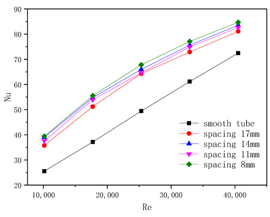 Figure 7 shows that Nu increases with Re (10,000–40,000) and is consistently higher for vortex-enhanced tubes compared to smooth tubes, highlighting their superior heat transfer. The 8 mm spacing achieves the highest Nu, 35.11% higher than the smooth tube, while the 17 mm spacing shows the smallest improvement (28.45%). Smaller spacing does not always guarantee better performance, as the 14 mm spacing outperforms the 11 mm spacing. The magnitude and direction of the fluid velocity continuously fluctuate, with the velocity increasing in radial flow. As a result, the flow boundary layer experiences constant disruption, maintaining a thin and discontinuous state. This dynamic interaction promotes strong mixing between the mainstream fluid and the near-wall fluid. The flow field alterations caused by the dimple structure disturb the boundary layer, thereby enhancing heat transfer.