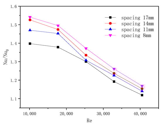Figure 8 shows the influence of varying dimple spacing on Nu/Nu0, and Nu/Nu0 shows a decreasing trend with Re, indicating that when Re is lower, the variation in dimple spacing has a more obvious influence on heat transfer performance. The effect of dimple spacing on Nu/Nu0 is the same as that on Nu.