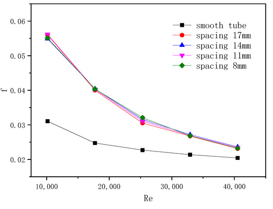 Figure 9 shows that the friction factor decreases with increasing Re. The smooth tube’s friction factor ranges from 0.019 to 0.030, while the vortex-enhanced tube ranges from 0.022 to 0.053 due to increased surface roughness. The difference in friction factors is minimal, varying between 0.36% and 4.94%.