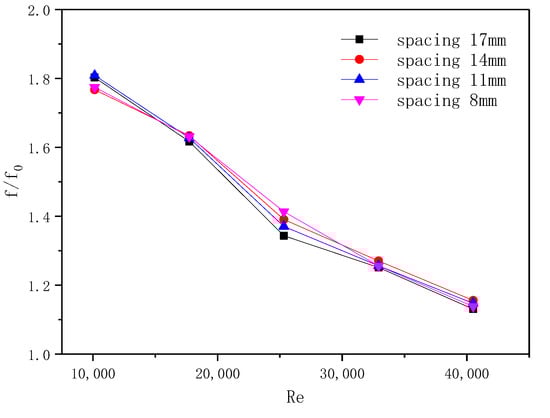 As shown in Figure 10, f/f0 decreases with the increase in Re, indicating that the change in dimple spacing has a more obvious influence on the resistance when Re is in a low range. The change in f/f0 is negligible between different spacing. It shows that the structure parameter of dimple spacing has little influence on the resistance.
