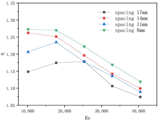 Variation in η with Re for the vortex-enhanced tubes with varying dimple spacing.