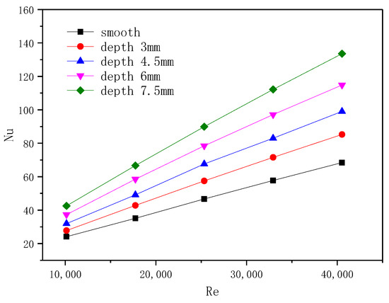 Variation in Nu with Re for the vortex-enhanced tubes with varying dimple depth.