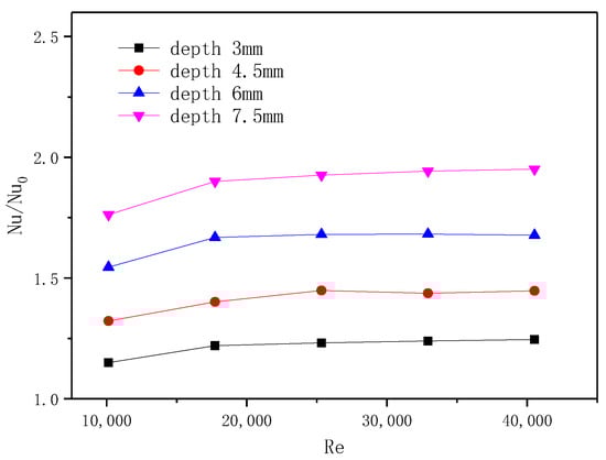 Figure 13 shows that Nu/Nu0 increases slightly before Re exceeds 17,000 and then remains nearly constant, with changes ranging from 0.4% to 2.1%. Deeper dimple depths result in higher Nu/Nu0 values.