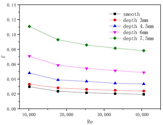 Figure 14 shows that the friction factor (f) is higher at low Re and decreases gradually with increasing Re. The friction factor of the vortex-enhanced tube is greater than that of the smooth tube, with deeper dimple depths resulting in higher friction factors. For a dimple depth of 7.5 mm, f ranges from 0.078 to 0.111, 73.3% to 75.1% higher than the smooth tube. For 6 mm, f ranges from 0.049 to 0.071, 58.2% to 60.3% higher; for 4.5 mm, f ranges from 0.033 to 0.048, 38.4% to 41.7% higher; and for 3 mm, f ranges from 0.024 to 0.033, 10.3% to 18.4% higher.