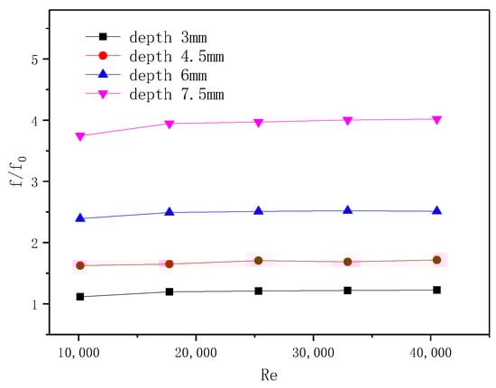 As shown in Figure 15, f/f0 at each dimple depth changes gently with Re. The deeper dimple depth tube has a higher f/f0 with the smooth tube. The f of the 7.5 mm dimple depth tube is significantly higher than that of other tubes.