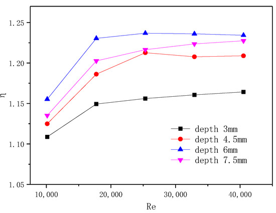 Figure 16 shows that η is low at low Re and levels off after Re reaches 17,000. The highest η occurs with a dimple depth of 6 mm, with a change range of only 0.51% after Re 17,000 and an average value of 1.23. The η of 7.5 mm and 4.5 mm dimple depth tubes after Re 17,000 are 1.22 and 1.20, respectively. The 3 mm dimple depth tube has the lowest η, with an average value of 1.16 after Re 17,000. The dimple depth’s effect on η increases significantly until reaching a critical value between 3 and 4.5 mm, after which the impact diminishes.
