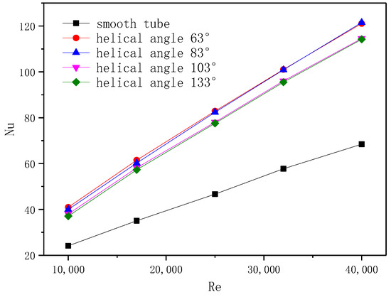 As shown in Figure 17, Nu increases positively with Re. The Nu of the dimple helical angle of 63° and 83° is similar and relatively higher, and the Nu of the dimple helical angle of 103° and 133° is similar. The heat transfer performance of the tube is stronger at high Re. With the increase in Re, Nu of the vortex-enhanced tube was increased relative to the smooth tube. the dimple helical angle of 63°, 83°, 103°, and 133° were increased, respectively, by 41.0–43.7%, 39.6–43.7%, 36.5–40.2%, and 34.9–40.1%.