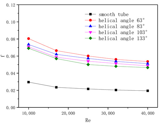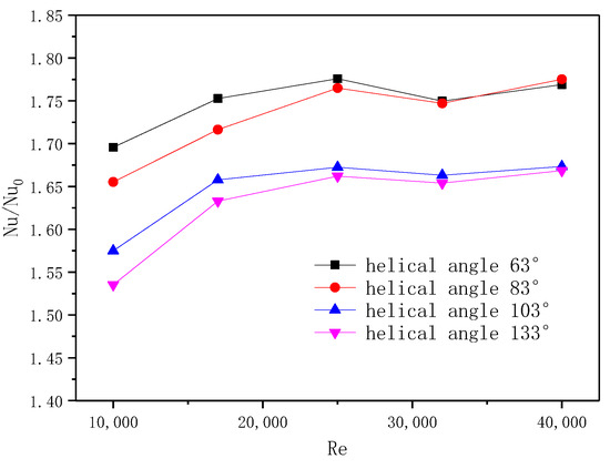 As shown in Figure 18, each dimple helical angle tube has an obvious increase trend with Re at low Re range of 10,000 to 17,000, and a gentle increase trend at high Re.