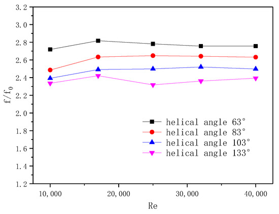 As shown in Figure 20, f/f0 at each dimple helical angle changes gently with Re. The influence of dimple helical angle on f/f0 is consistent with the influence trend on the Nu ratio. The tube with large Nu/Nu0 has relatively large f/f0, and the average f/f0 of the 63–103° tube is 2.77, 2.61, 2.48, and 3.37, respectively.