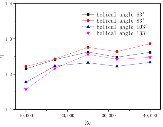 As can be seen from Figure 21, with the Re increase, η firstly increases and then flattens. The η of the tube with 83° dimple helical angle is stronger than that of other tube types, and the average η is 1.26. η of the tube with 103° and 133° dimple helical angle is low, and η are both 1.22. However, the η of the tube with a 103° dimple helical angle is higher when the Re is below 17,000. With the increase in Re, the η of the tube with a 133° dimple helical angle is higher than that of 103°.