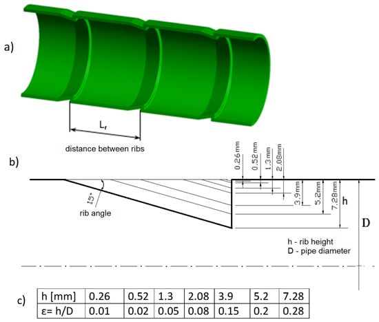 Figure 1 shows the first of the geometries studied: a pipe with transverse, asymmetrical ribs, which were created by deforming the wall. A wide range of rib dimensions was investigated numerically: 7 heights h with 7 different longitudinal distances Lr between them, resulting in 7 × 7 = 49 different rib configurations. Figure 1c shows the heights of the ribs studied and the corresponding dimensionless values, while the longitudinal distances are given in Table 1.