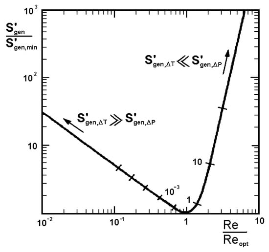 In Figure 5, a graphical illustration of Equation (4) is shown. This is a graph created on the basis of theoretical values, where the generated total entropy S′gen is normalized by the generated minimum entropy of the thermodynamic system S′gen,min. Based on numerical simulations of the same flow channel section, the same graph can be plotted, but Equation (2) is required to calculate the total entropy S′gen.