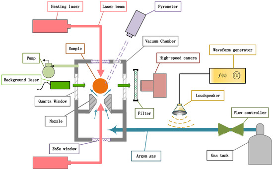 The experimental setup, named ALSEE (Aerodynamic Levitation-laSEr hEating installation for melt properties), has been developed at China Nuclear Power Engineering Co., Ltd. (CNPE), Beijing, China for measuring the thermophysical properties of corium. The schematic diagram is illustrated in Figure 1. The ALSEE facility comprises an aerodynamic levitation system, laser heating system, temperature measurement system, optical imaging system, acoustic excitation system, and vacuum chamber system.