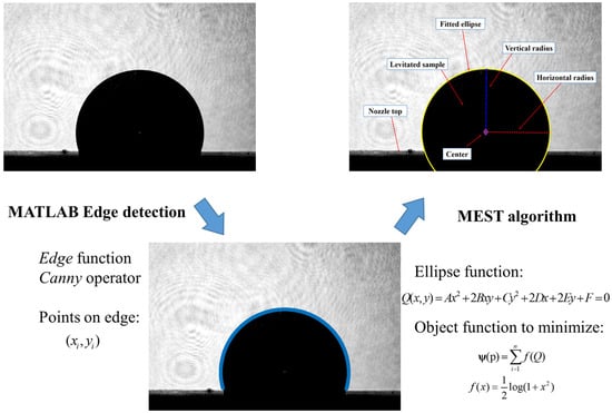 Under the combined influence of gravity and levitating gas, high-temperature melts in aerodynamic levitation experiments form an axisymmetric ellipsoidal shape, with the difference between the horizontal and vertical radii typically being within 2% [21]. A commonly used ellipse-fitting algorithm is the MEST algorithm, as shown in Figure 3, with detailed principles available in the reference [22].