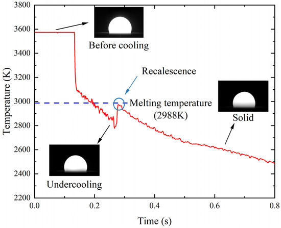 Density was measured during a rapid cooling process. Figure 4 illustrates the cooling of a ZrO2 sample. The levitated sample was initially heated to a very high temperature using lasers. Once the drop stabilized, the lasers were deactivated, causing a rapid temperature decrease. Due to the latent heat exceeding heat losses from convection and radiation, the drop entered an undercooling state before recalescence, during which the temperature rose sharply, nearing the melting temperature. After recalescence, the liquid sample transitioned to a solid state. A high-speed camera captured the drop shape throughout the cooling process to calculate its volume. Density data were derived by analyzing images taken between the start of cooling and the recalescence phase.