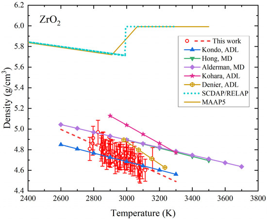 Measured density data for liquid ZrO2 are presented in Figure 5, alongside published data and models. The data used in the detailed code SCDAP/RELAP [25] and the integral code MAAP5 [26] were sourced from reports by the Idaho National Lab and Electric Power Research Institute. These data are significantly higher than the experimental results, potentially leading to inaccuracies in severe accident simulations. Molecular Dynamics (MD) calculations [27,28] show better alignment with experimental data; however, their reliability still depends on experimental benchmarks, as model parameters are adjusted using experimental results.
