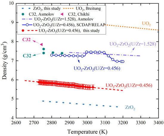 Given the limited availability of density data, Figure 6 also includes data for ZrO2, UO2, C32, and the UO2-ZrO2 mixture with a U/Zr molar ratio of 1.528. The density of UO2 was measured by Breitung and Reil [34] and was also suggested by Fink [35] in a review article. The results of this study are consistent with the observed trends in density changes as the composition varies.