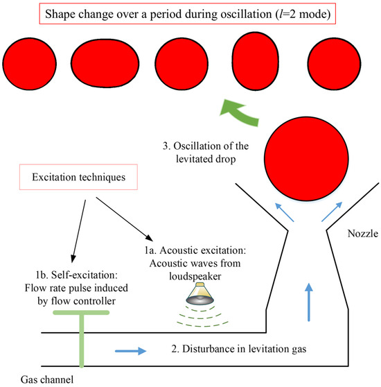 Surface tension can be measured by the drop oscillation method in ADL experiments. In previous studies, acoustic excitation as illustrated in Figure 7 was used to induce oscillations in molten drops, such as liquid Al2O3. The acoustic waves from the loudspeaker cause disturbances in the levitation gas. The disturbance was then transmitted along the gas channel to the levitated drop. A frequency scan was conducted to analyze the drop response. The typical duration of measurements was 20–30 min [12]. However, ZrO2 exhibits high volatility near its melting temperature, leading to a significant reduction in sample mass during acoustic excitation. This results in a substantial shift in the resonant frequency, compromising measurement accuracy. Therefore, this study used the self-excitation technique for surface tension measurement of liquid ZrO2.