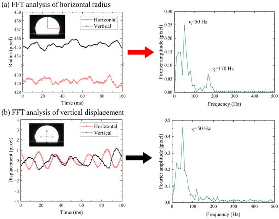 Figure 8 shows the radius variation and the Fast Fourier Transform (FFT) analysis for a 24.17 mg ZrO2 drop at 3178 K. Two distinct peaks were observed at 50 Hz and 170 Hz. The 170 Hz peak was identified as the resonant peak, as image analysis revealed that the vertical displacement frequency of the sample matched the 50 Hz peak. The vertical displacement was derived from the coordinates of the ellipse centroid, which were also calculated in the MEST algorithm during ellipse fitting. Using Equation (3), the surface tension at 3178 K was determined to be 0.82 N/m.
