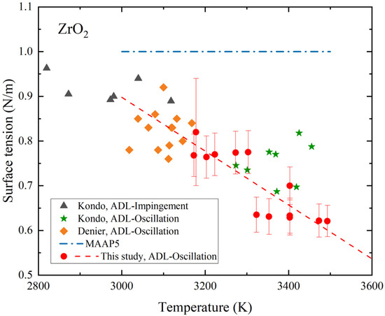 - Kondo, T.; Muta, H.; Ohishi, Y. Droplet Impingement Method to Measure the Surface Tension of Molten Zirconium Oxide. J. Nucl. Sci. Technol. 2020, 57, 889–897. [Google Scholar] [CrossRef]